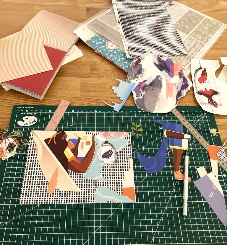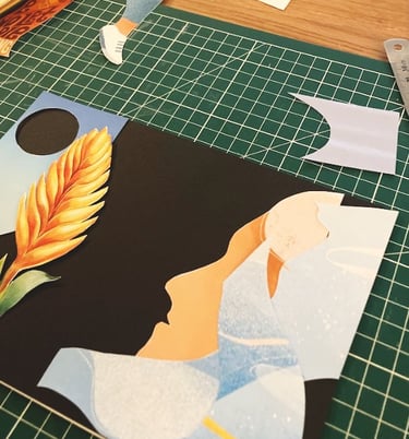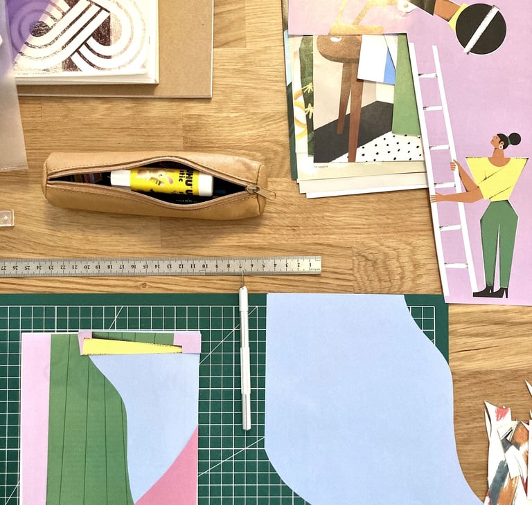 Commence alors le grand balai d'assemblage, le mélange de styles, l'envie d'exprimer quelque chose. Une fois que le rendu fait vibrer ma corde sensible, tout est collé, puis numérisé en HD afin de pouvoir finaliser le rendu digital parfait et que la taille d'impression soit personnalisable à votre guise.